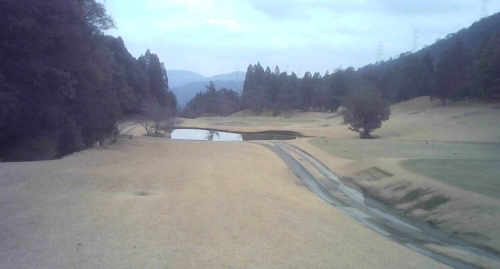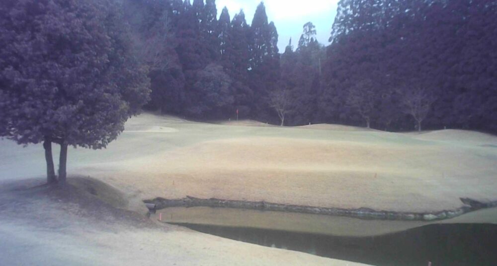 比較的距離の短いショートホール、池は特設ティーよりプレイング3、OBはプレイング4、目の前池越えのティーショットになるが力まずにグリーンセンターから攻めるのが賢明。