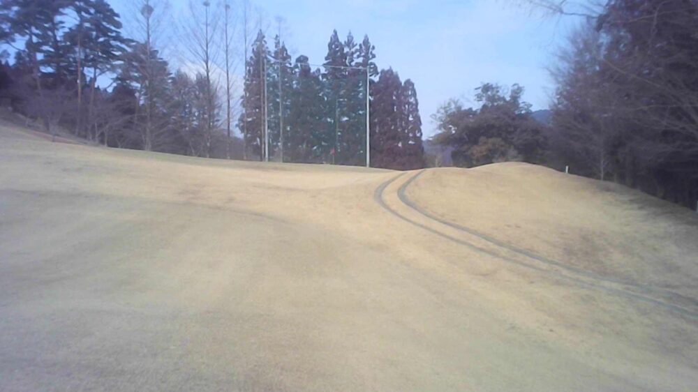 左ドックレック、センター◎マト狙いフロントティーより180ヤードがベスト、セカンドは打ち上げで大きめのクラブで攻める。カート道より下につけるとラフが深いため2オンが困難になるので注意。(コース正面、駐車場注意)。☆正面突き抜け注意。