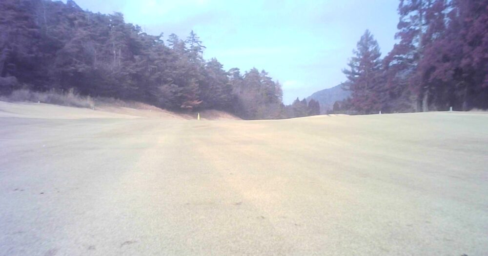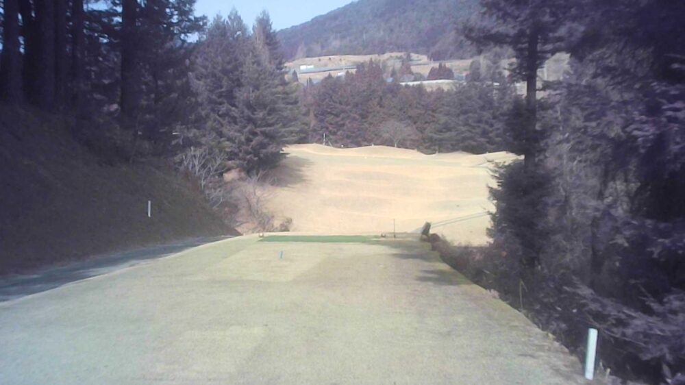 高低差33m打ち下ろし右ドックレック、左右OB、ドライバー飛距離がでる方は注意、安全にアイアンで攻め確実パーオンがお勧め、吹き流し特設ティを越えると左に若干のスペースがあるのでセーフの可能性もある。(右側コース隣接のため注意)☆正面突き抜け注意。