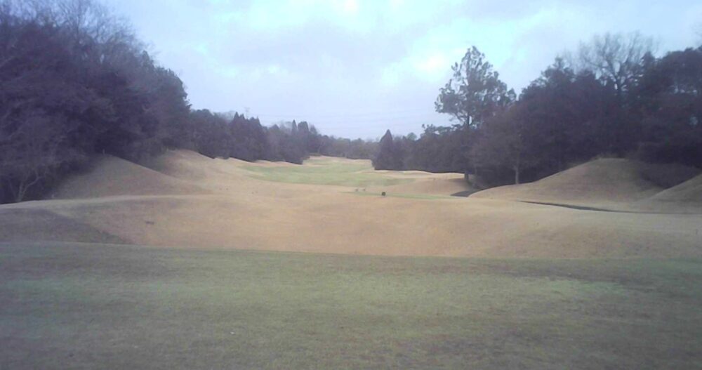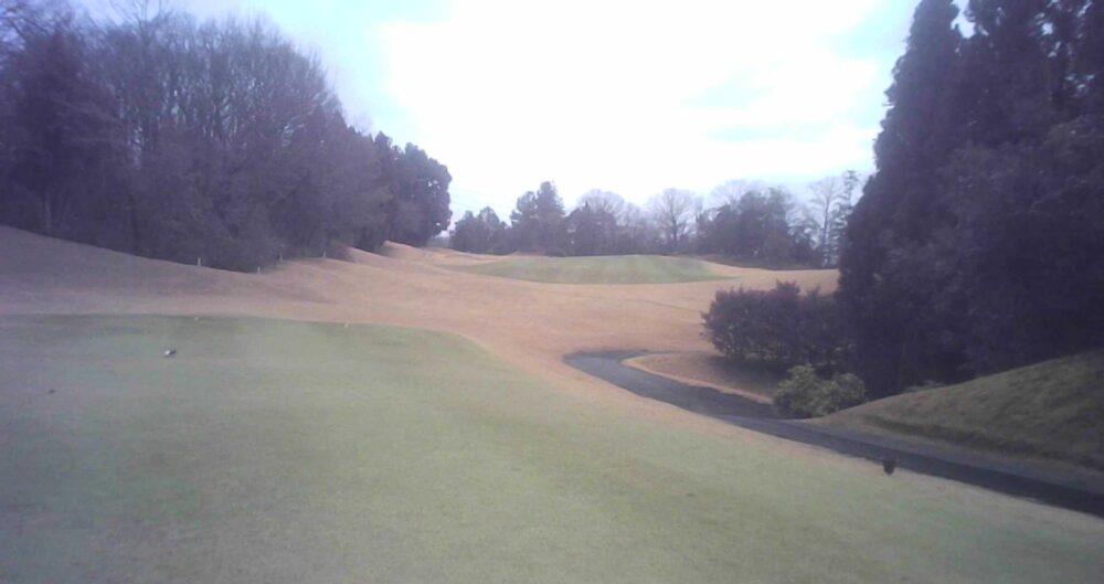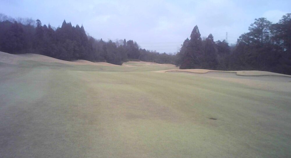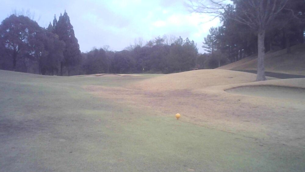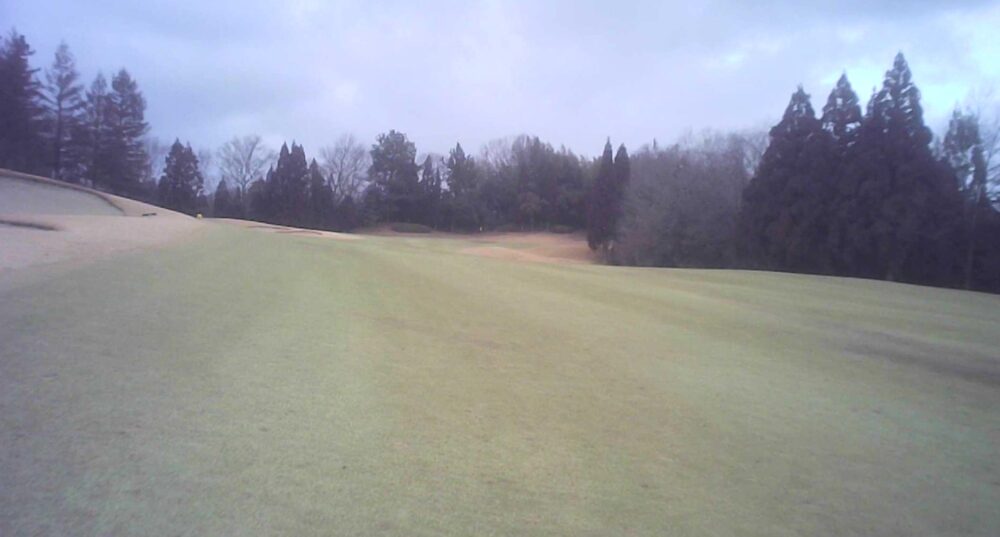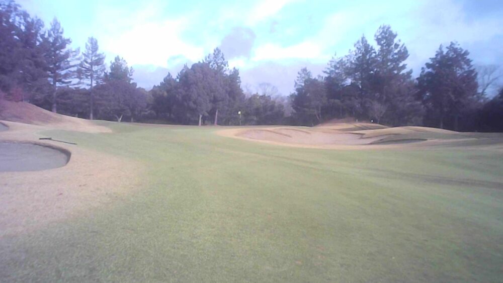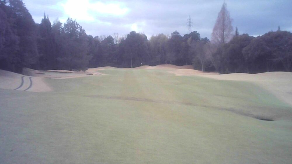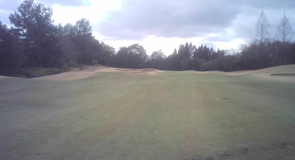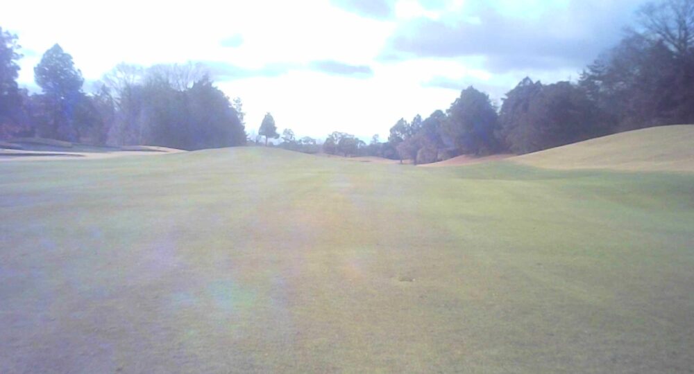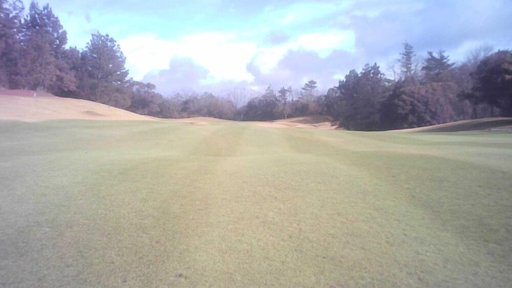 一見すると真っ直ぐでフラットなフェアウェイ。距離のあるこのミドルホールは綿密な攻略が必要。ティショットもセカンドも、距離が要求される。セカンド地点からはなだらかな上りで距離感も難しい。18ホールで一番大きく強烈な2段グリーンは乗る位置によっては大変難しい。