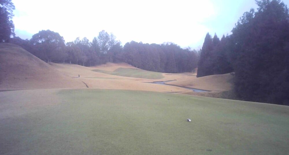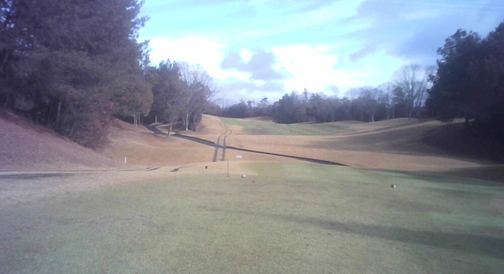 堅実に行くか、大胆にいくか。稜線と木々が美しい右ドッグレッグのミドルホール。安全な攻め方はフェアウェイ左側。右側を狙って大胆に攻めていく戦略も。セカンド地点からグリーンが一望出来る。