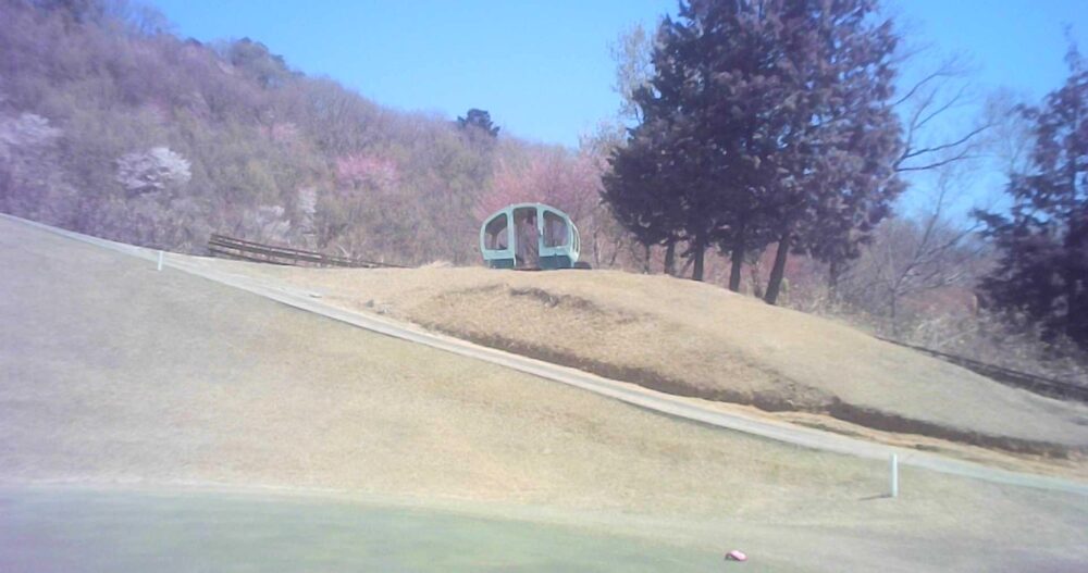 見た目のやさしさに騙されるショートホールです。左サイドを狙い目にするのが安全です。グリーンは左から右と手前に向かってよく転がるので、ワンオンしても油断禁物です。☆グリーン左手にモノレールの残骸が。