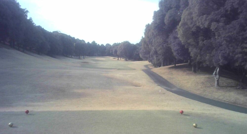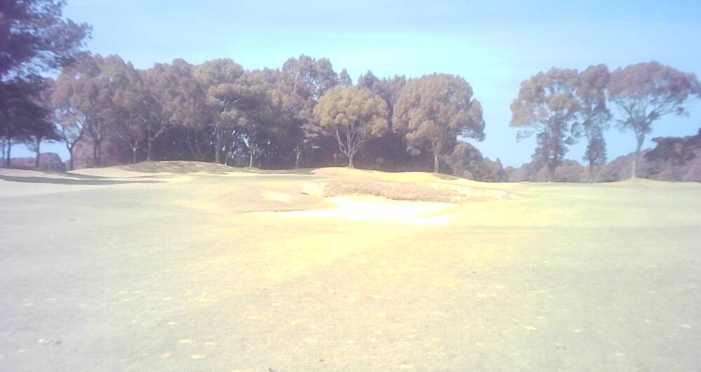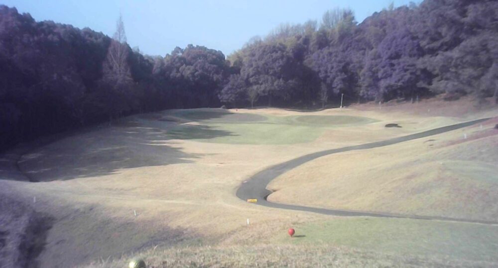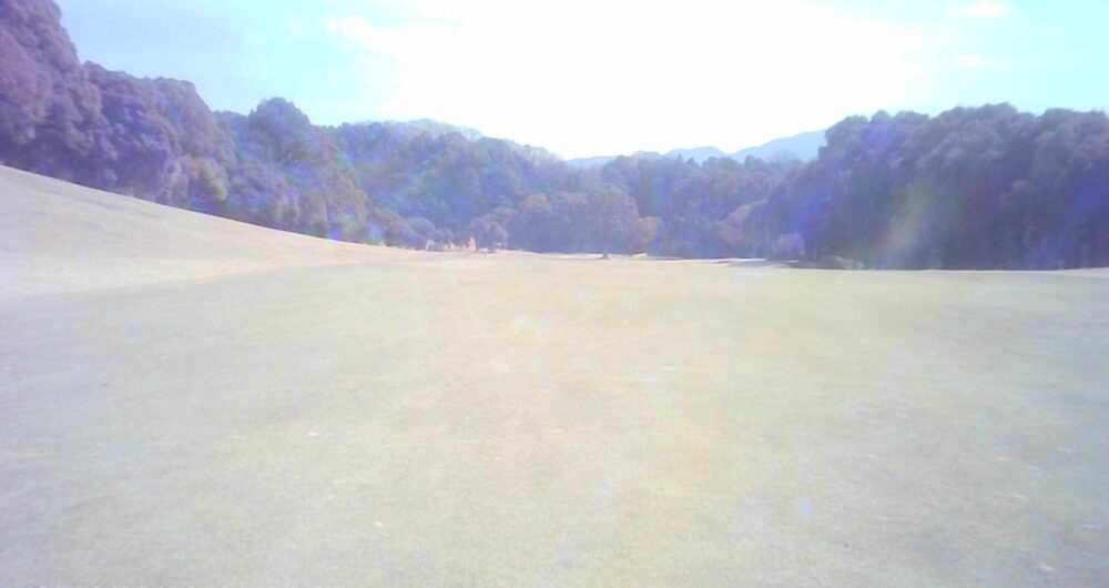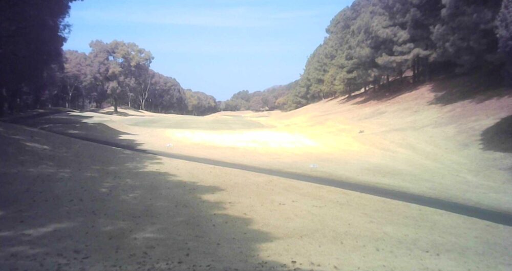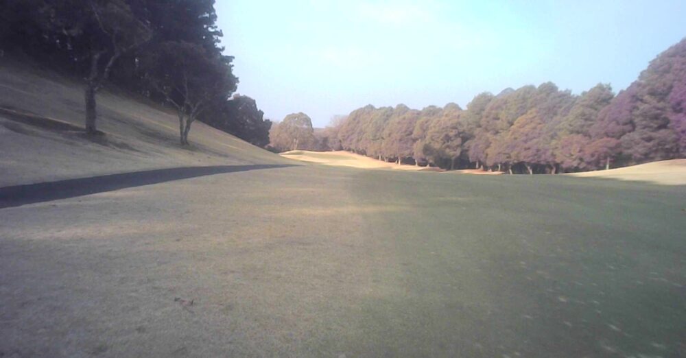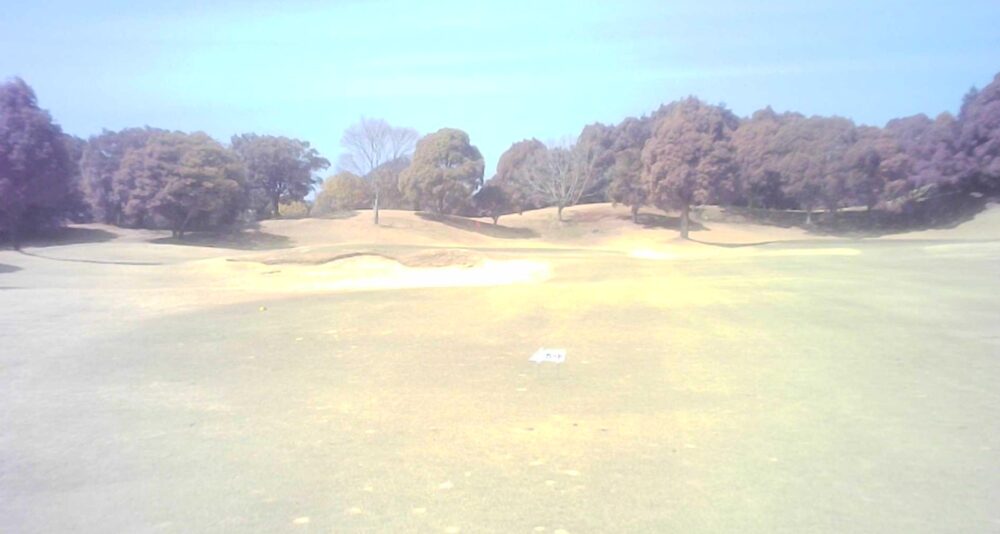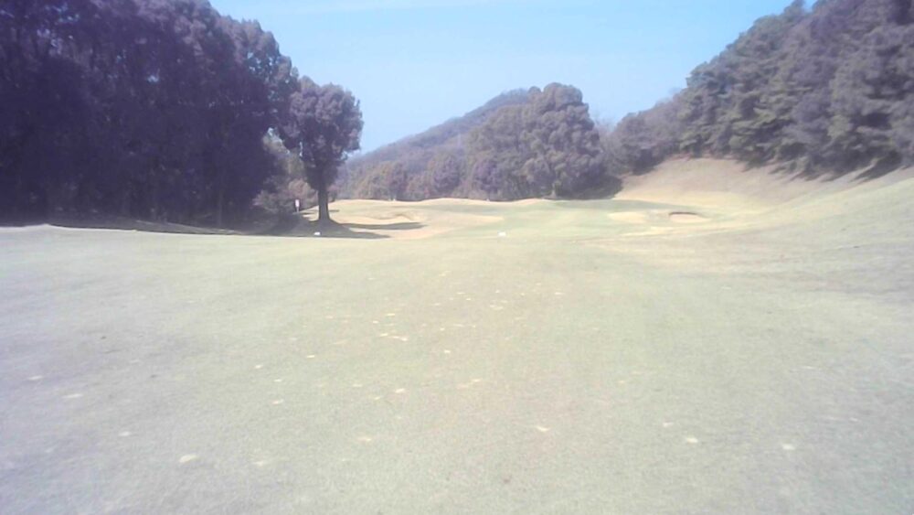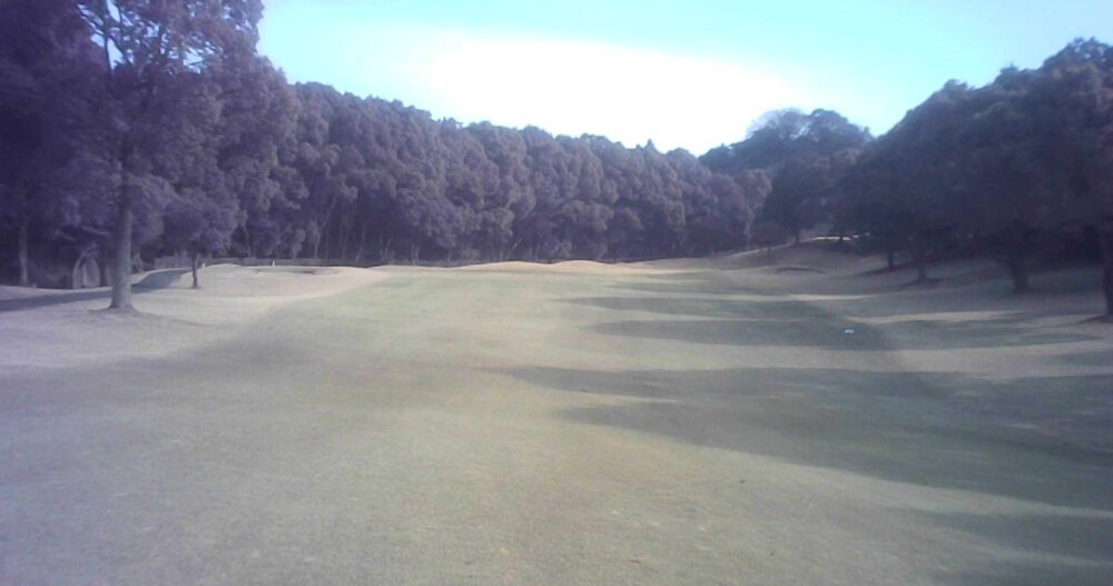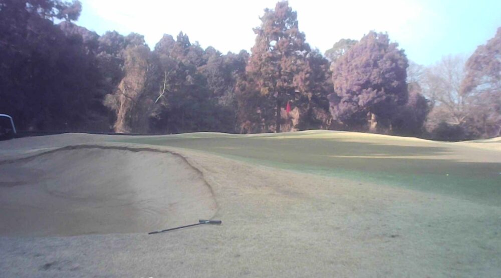 距離のあるミドルホール。ティショットは前方に見える鉄塔を目標にアドレス。グリーン奥は狭いが手前も大きく窪んでいるので正確な距離を必要とする。☆セカンド引っ掛け注意(即OB)。