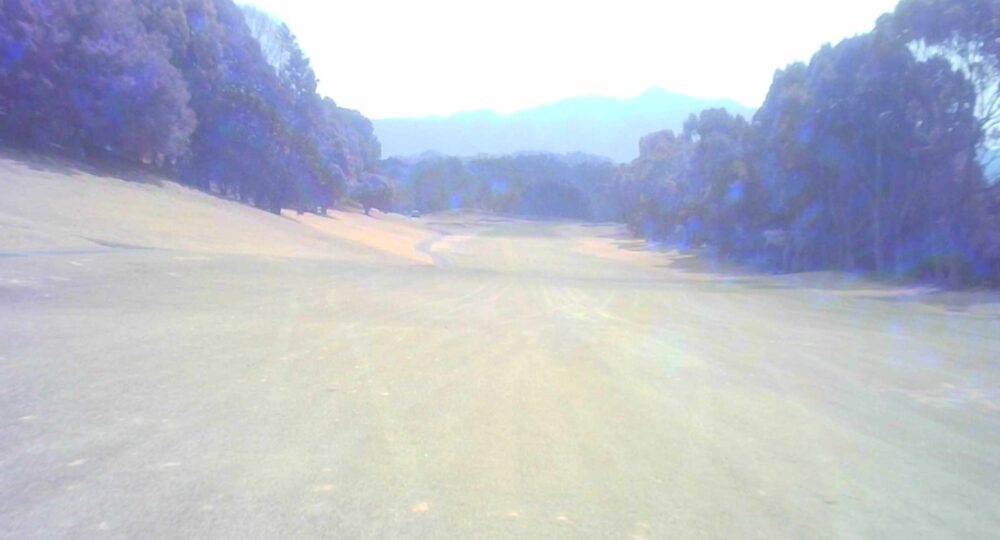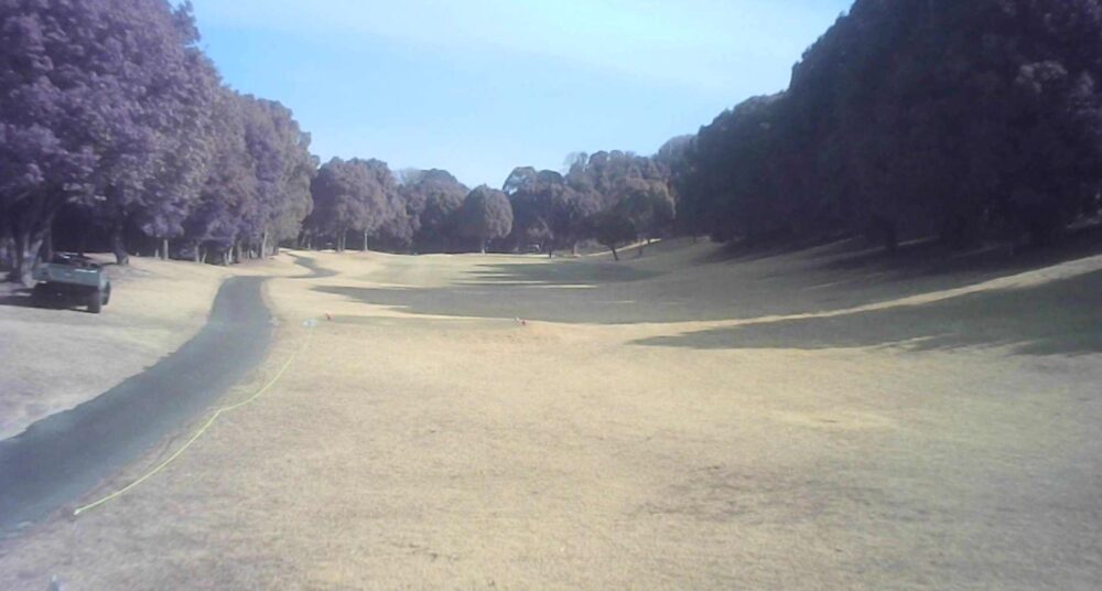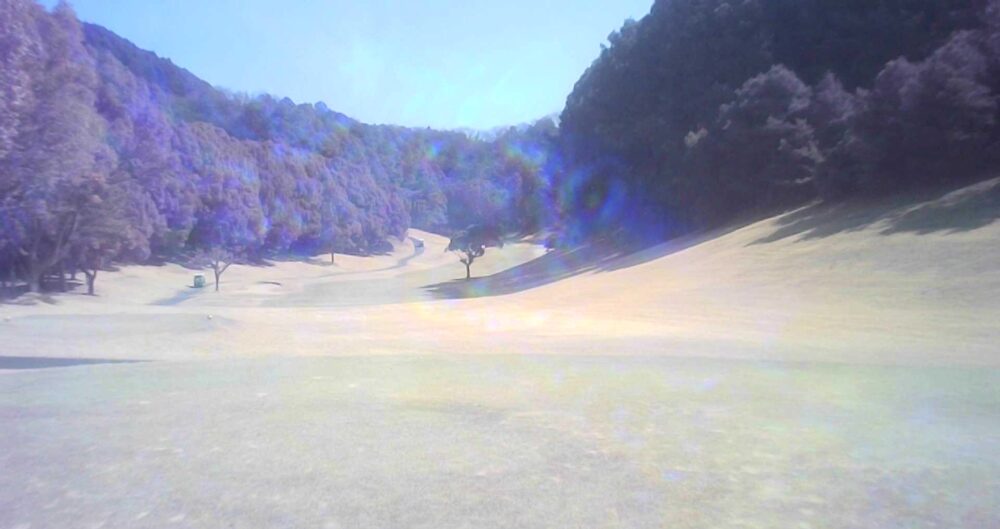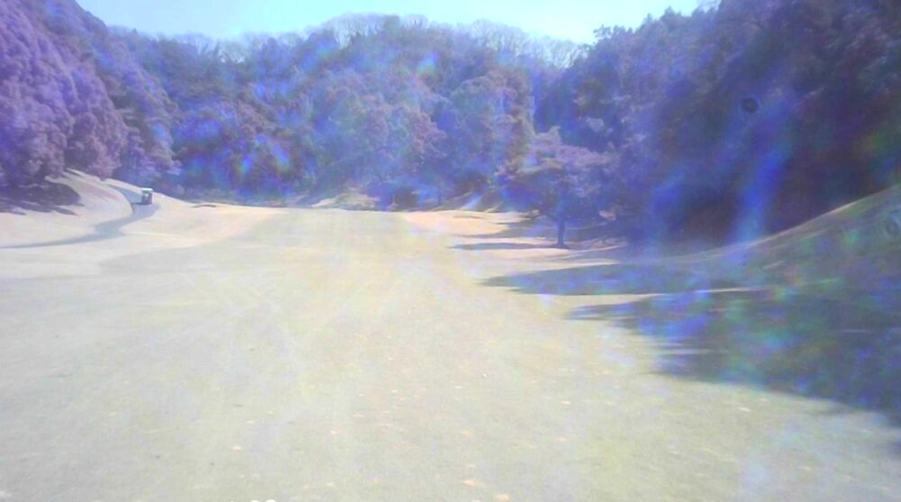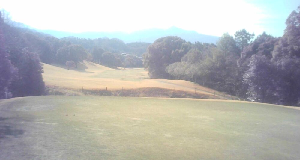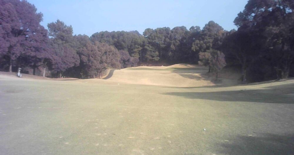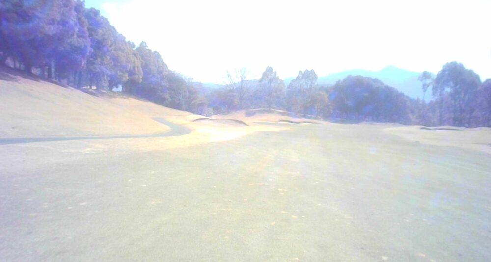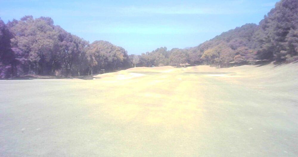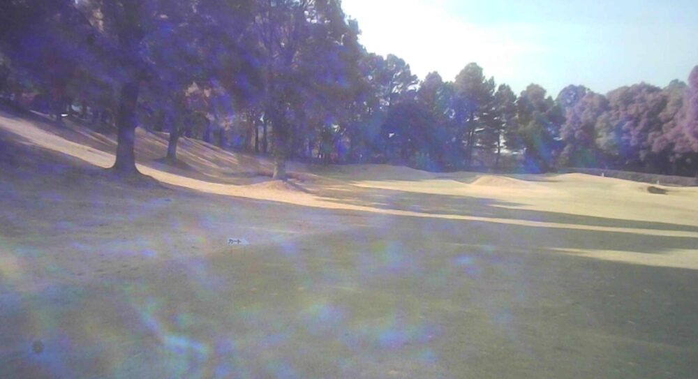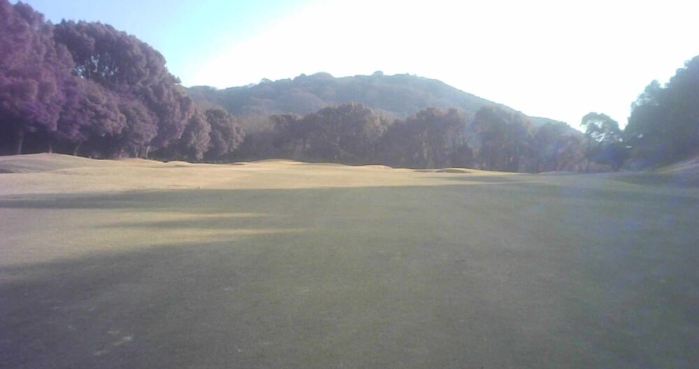 距離のあるミドルホール。ティショットは前方に見える鉄塔を目標にアドレス。グリーン奥は狭いが手前も大きく窪んでいるので正確な距離を必要とする。☆セカンド引っ掛け注意(即OB)。