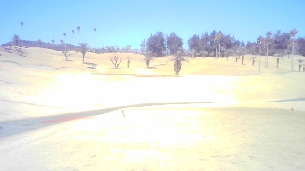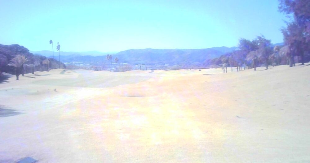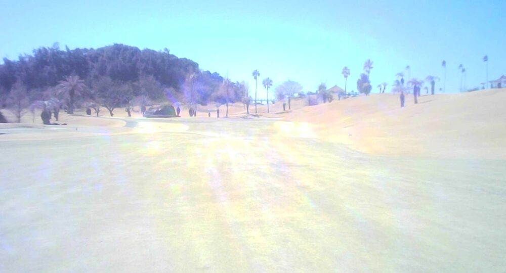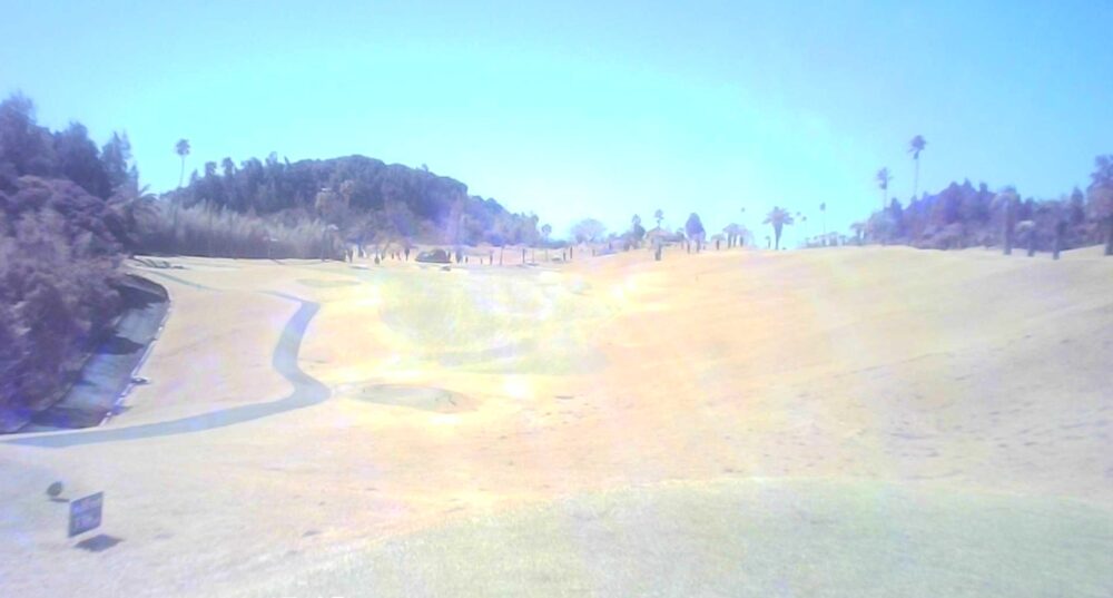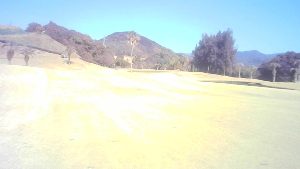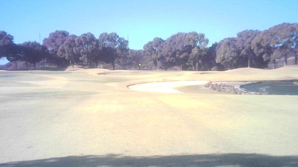 南に見える太平洋に向かって打っていく、右ドッグレッグのミドルホール。ティグランドのすぐ前に池があり、左サイドがOB。ソテツがずっと植えられています。ここはティショットの打ち下ろしでセカンドから打ち上げ。コーナーにはバンカーが待ち構えているのであくまでもバンカー左側に見えるワシントンパームをめざして打ちましょう。