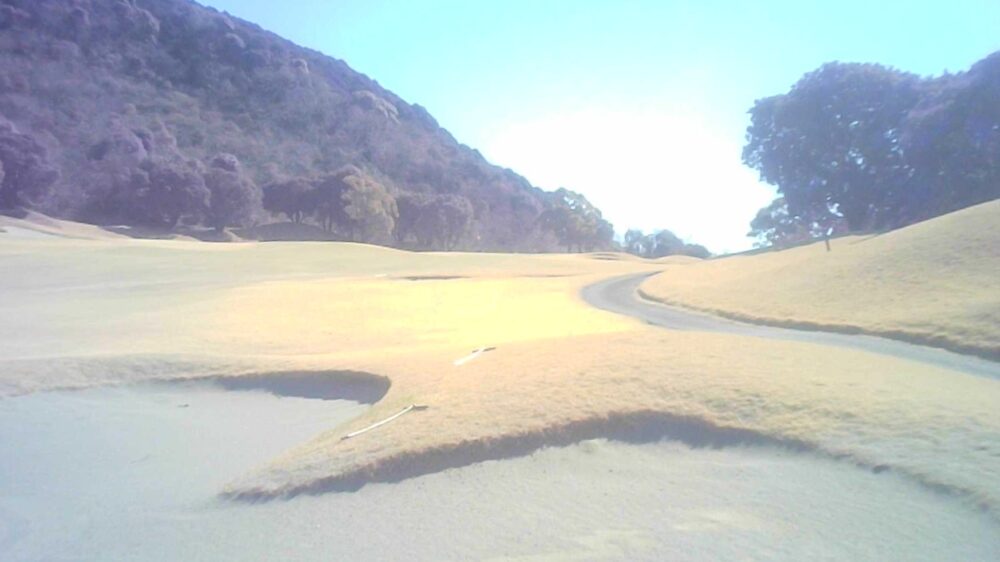 ほとんどフラットに近い、やや打ち上げのミドルホールです。グリーンはちょっと上がり気味。しかし、このグリーンは、右手前に大きなマウンド-という曲者で、難易度の高いホールとなっています。全体的にはフェアウェイの幅もたっぷり。コンペの際、ドラゴン賞の設定ホールとしてお楽しみいただけそうです。