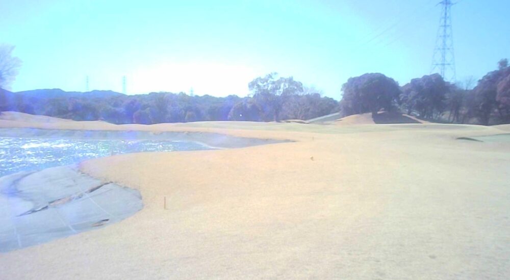 コース全体が右へ「く」の字にドッグレッグしていて、まんなかには池。ティグランドからは、この池がブラインドになっているだけに左に見えるバンカーを狙って打つとルートが開けます。セカンド地点からは、ずっと右側が池になり、池があってバンカー、またバンカー。ショートカットしていくと攻めにくくなります。ここはあくまでティショットを池を避けて左に打ち、そこから思い切ってセカンドを狙うのがベター。手前からが無難。