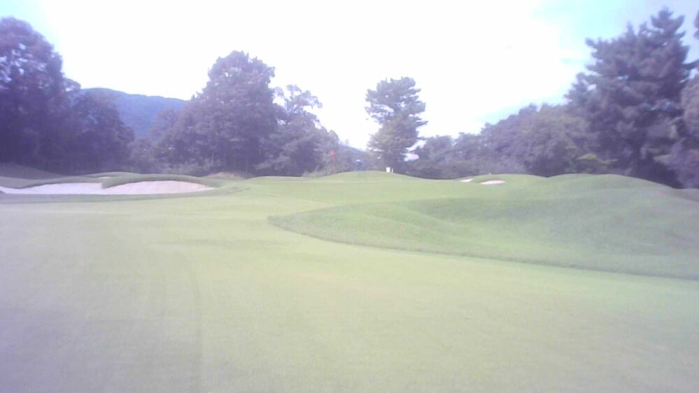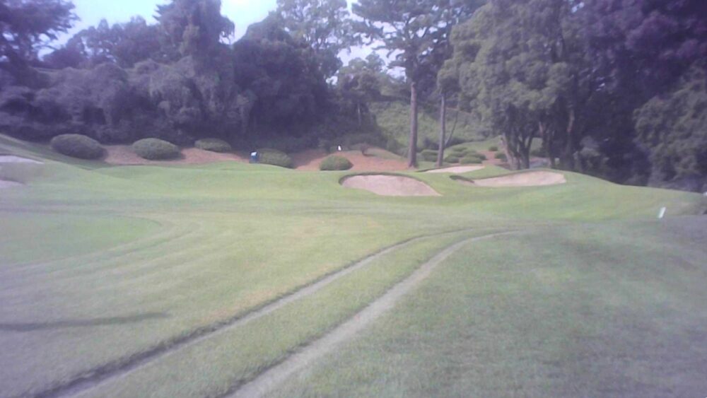 ティーショットはフェアウェイ右バンカーを避け左サイド狙い。ただし、その先残り80ヤード付近からくぼんでいるため打ち過ぎに注意する事。グリーン手前バンカーにつかまると厄介。