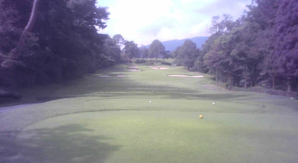 右ドッグレッグのパー5。ティーショットは左サイドが狙い目。グリーン手前50ヤード付近には松があるため刻むか攻めるかの判断が必要。グリーンは左手前から右奥へ縦長の2段グリーン。☆特徴のあるホールで忘れませんね。