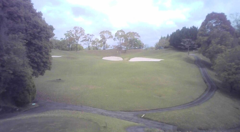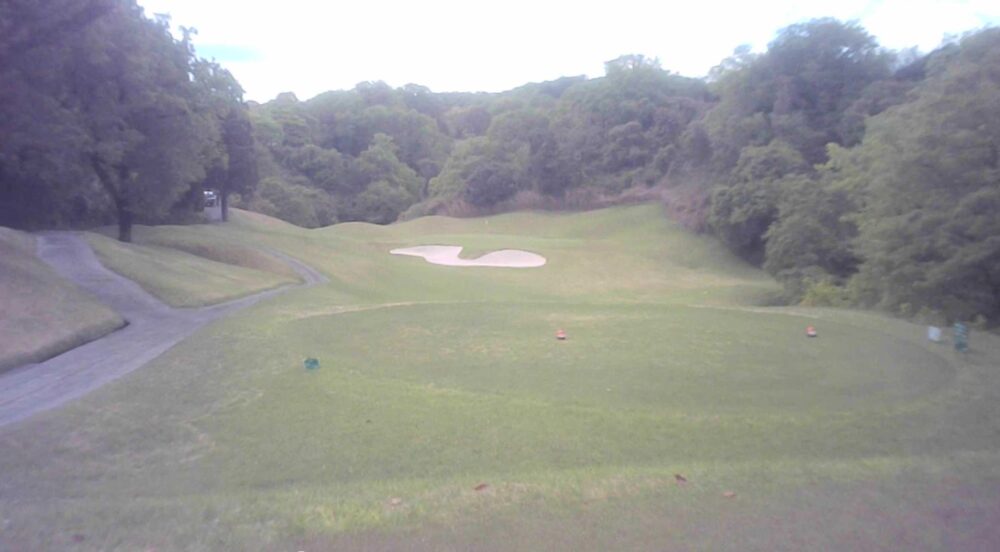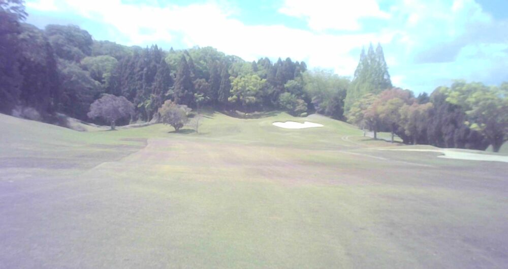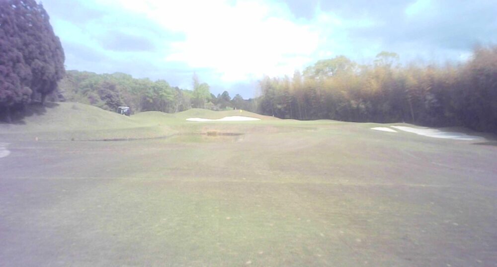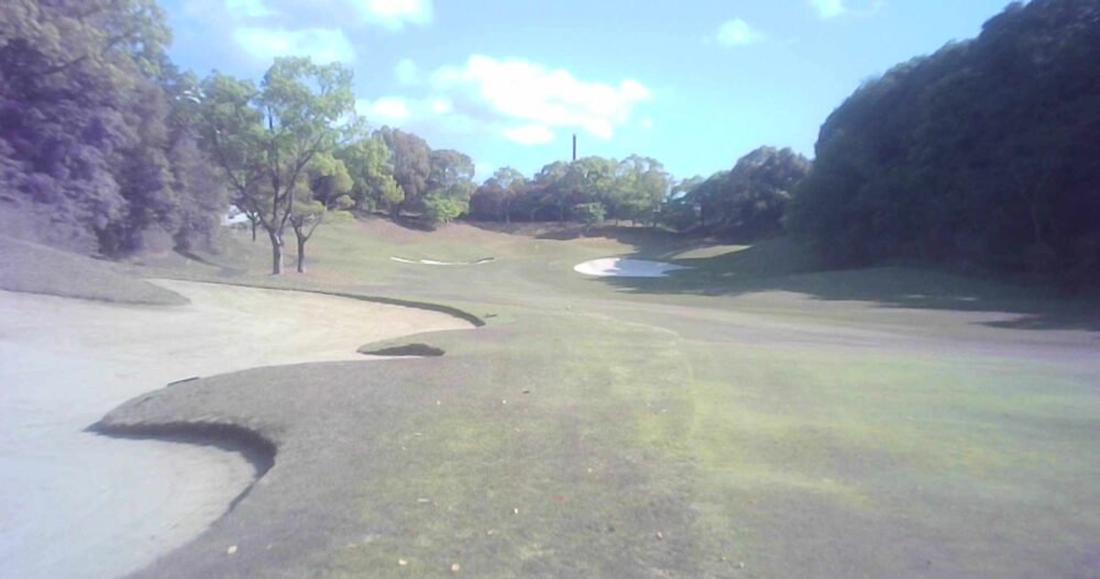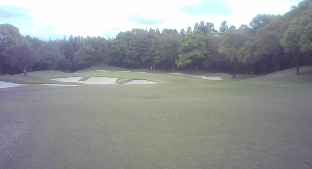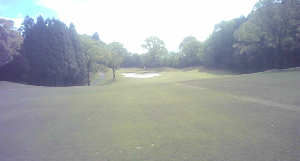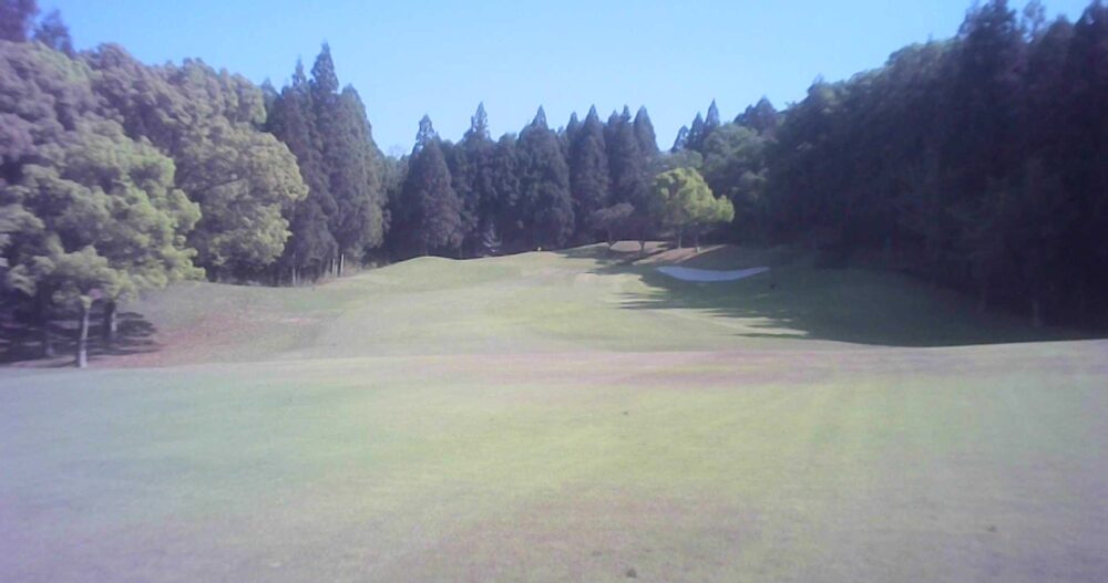 第1打は左バンカーの右サイドねらい。第2打以降は右狙い。杉の木を越えた残り150ヤード付近の右サイドにフラットなポジションがある。前方の谷に入った場合、グリーン付近のドロップエリアから1ペナでプレーを続行することが出来る。