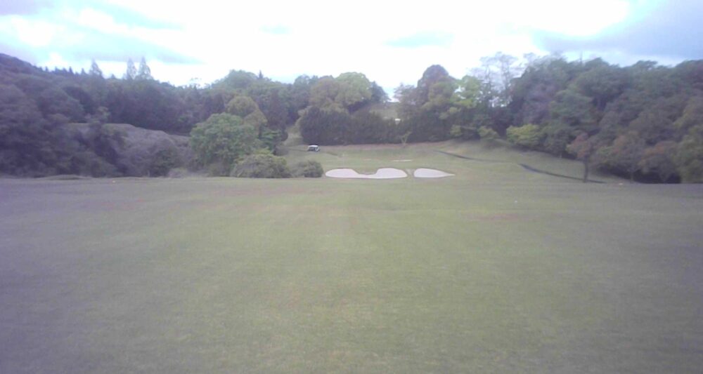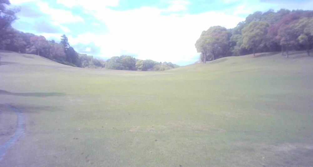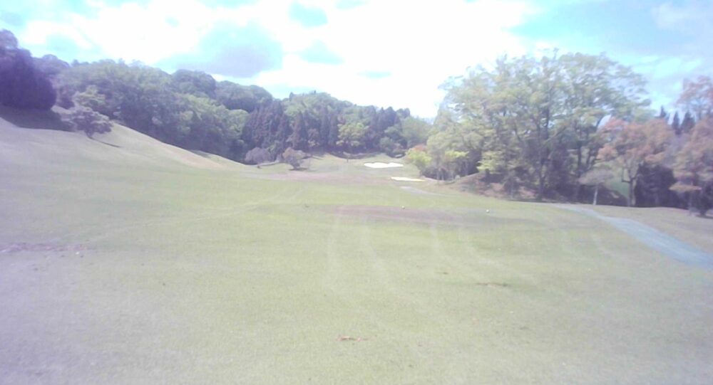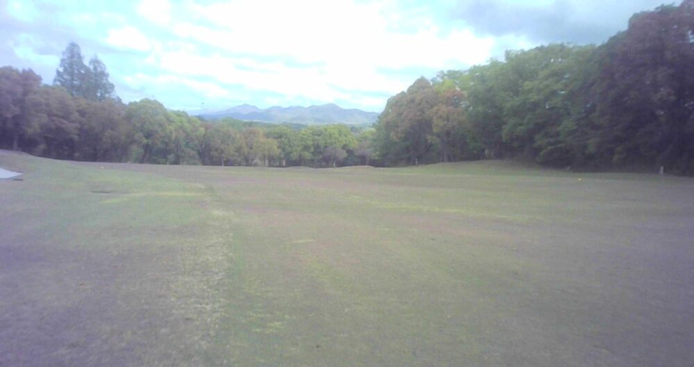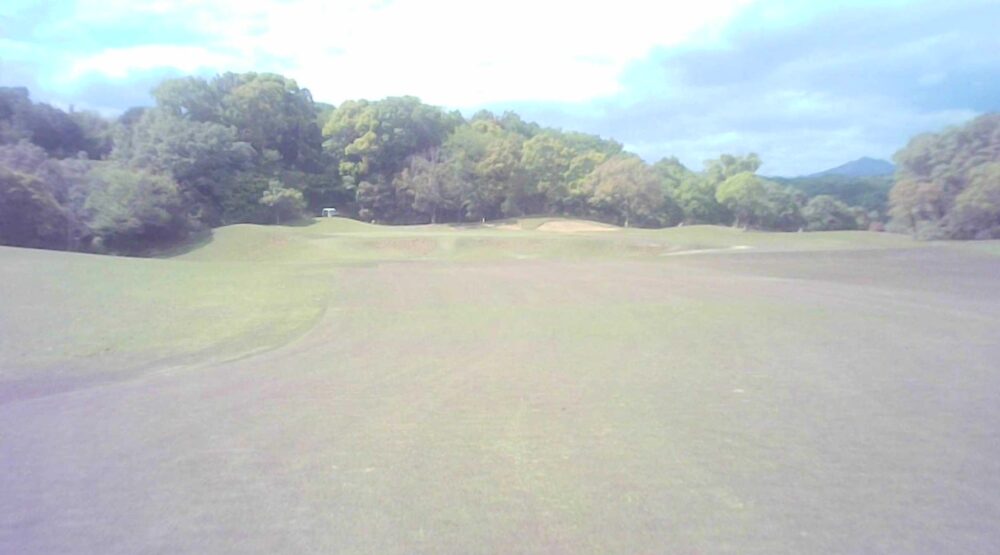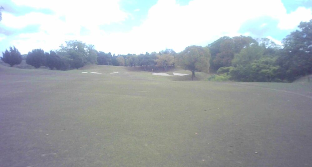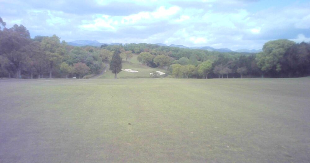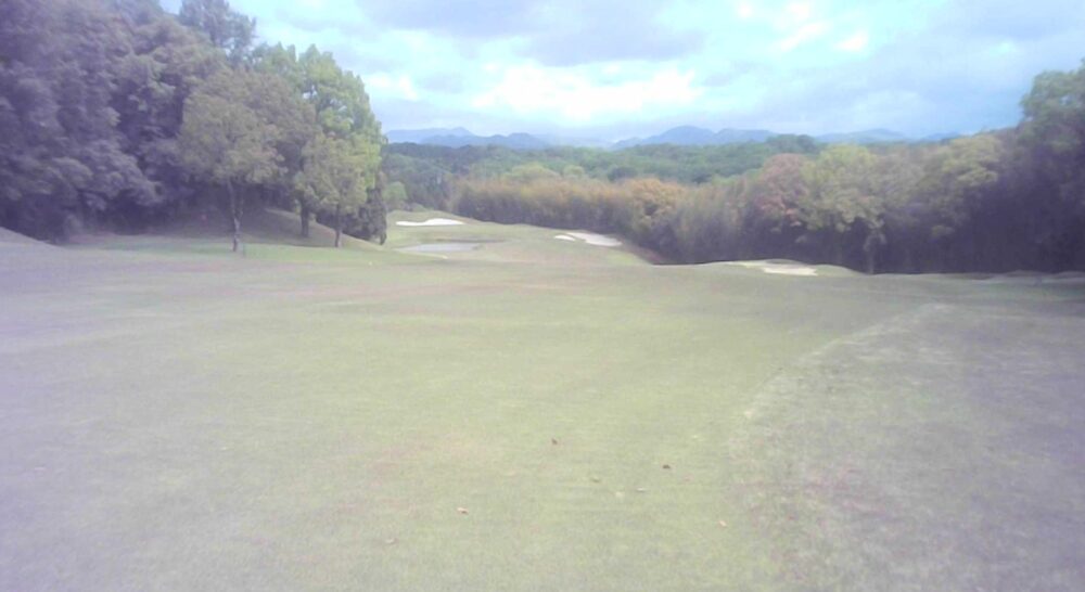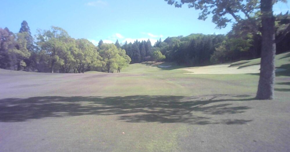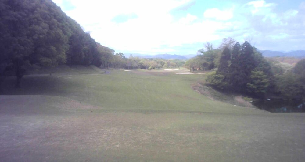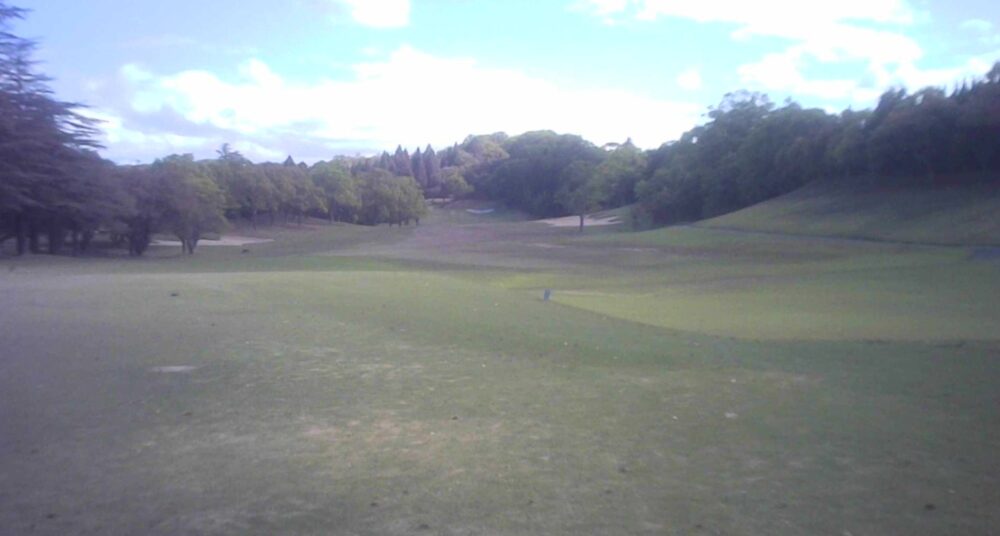 距離の長いミドルホール。第1打はフェアウェイ左狙い。第2打以降は打ち上げ。