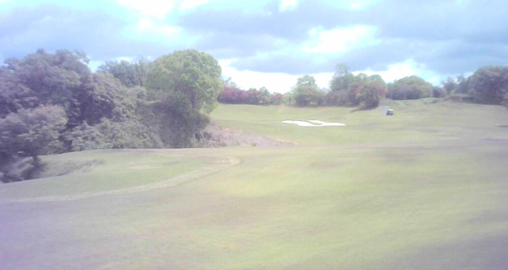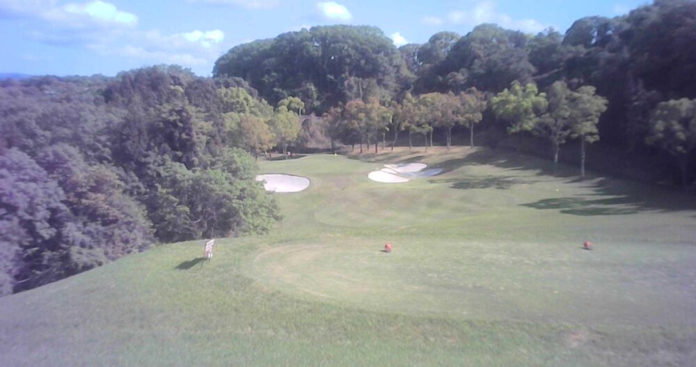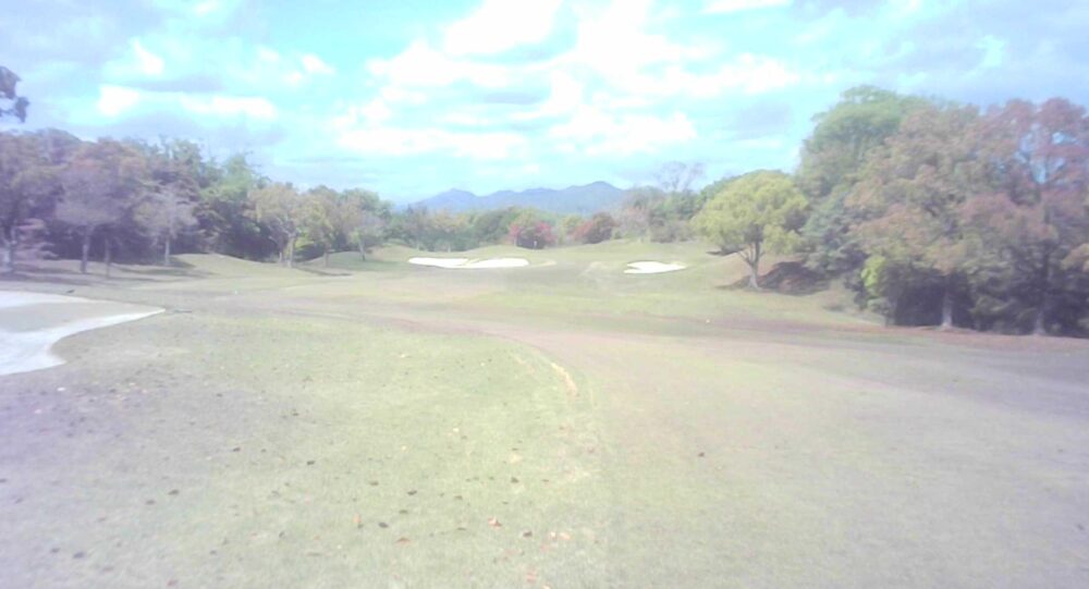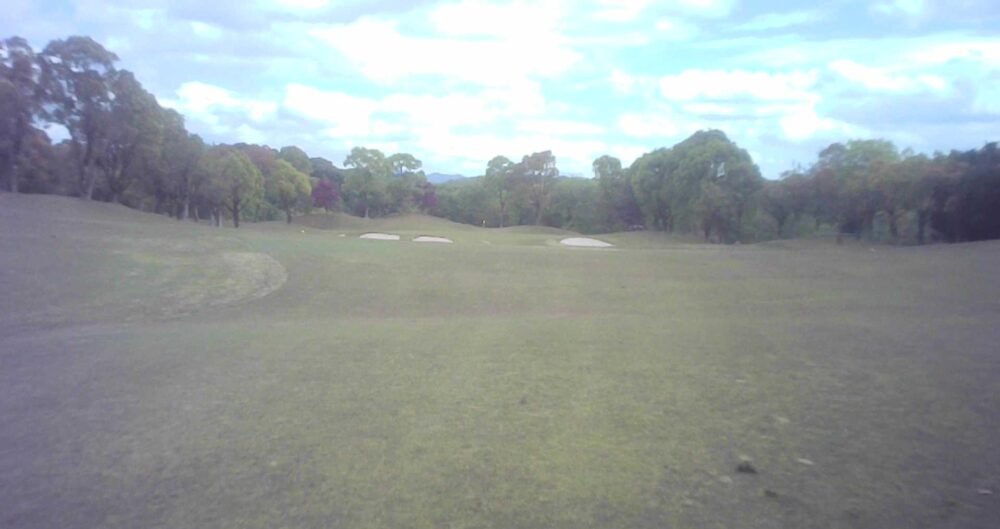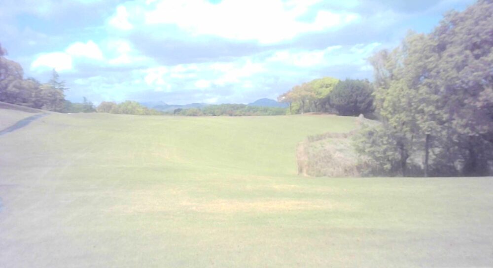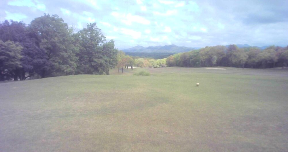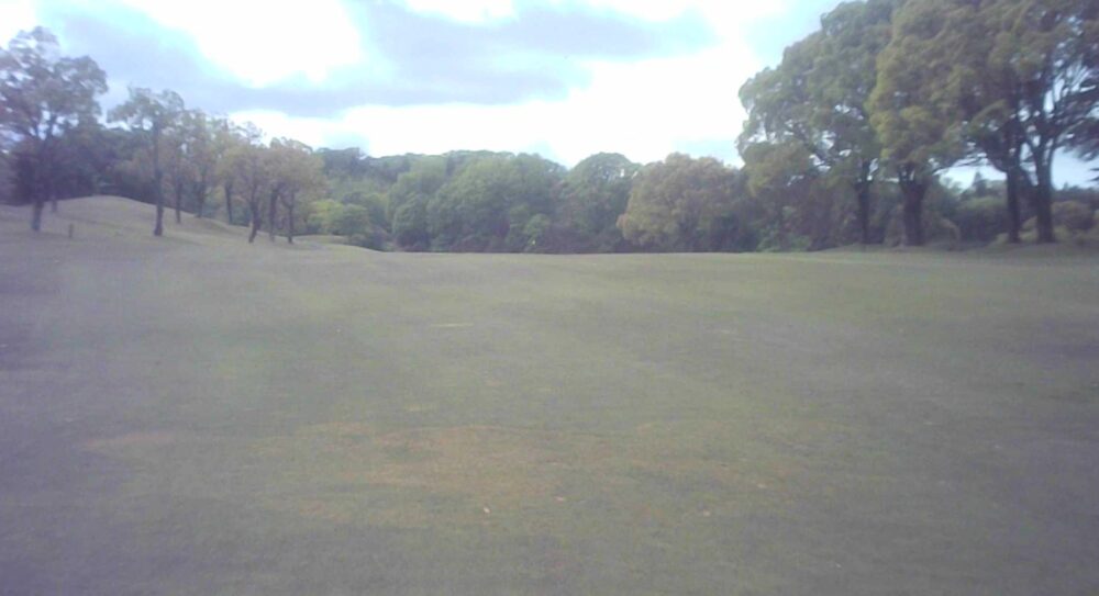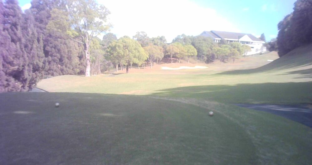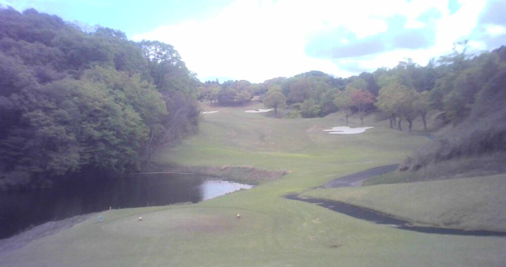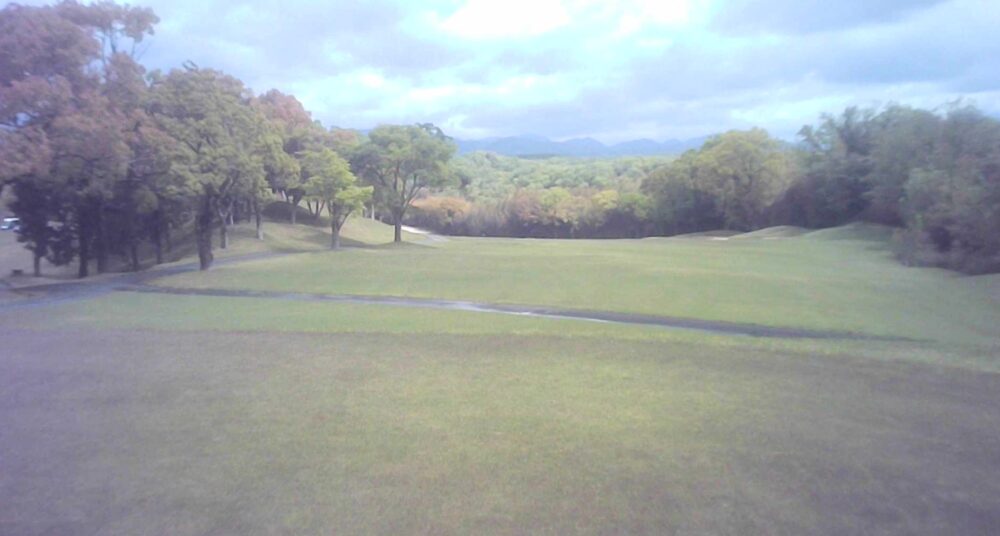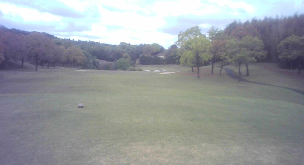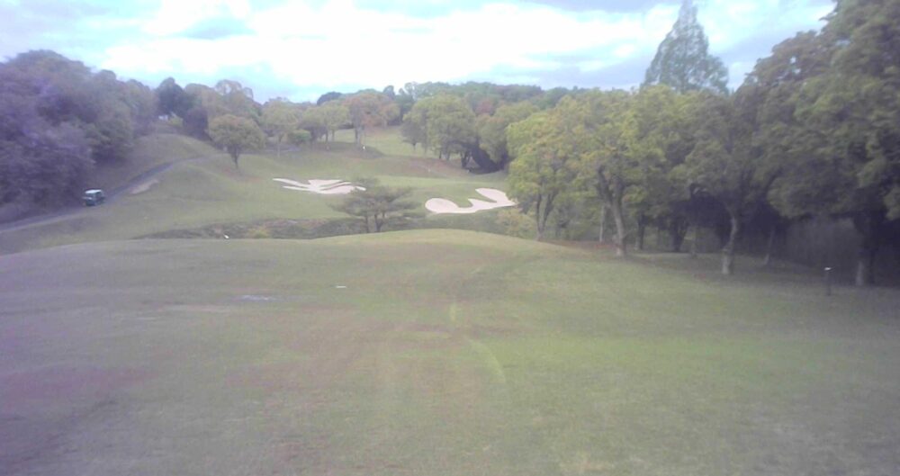 距離の長いミドルホール。第1打はフェアウェイ左狙い。第2打以降は打ち上げ。