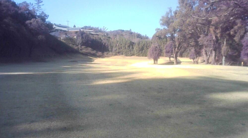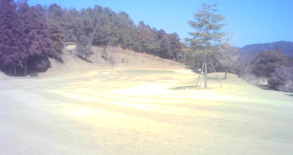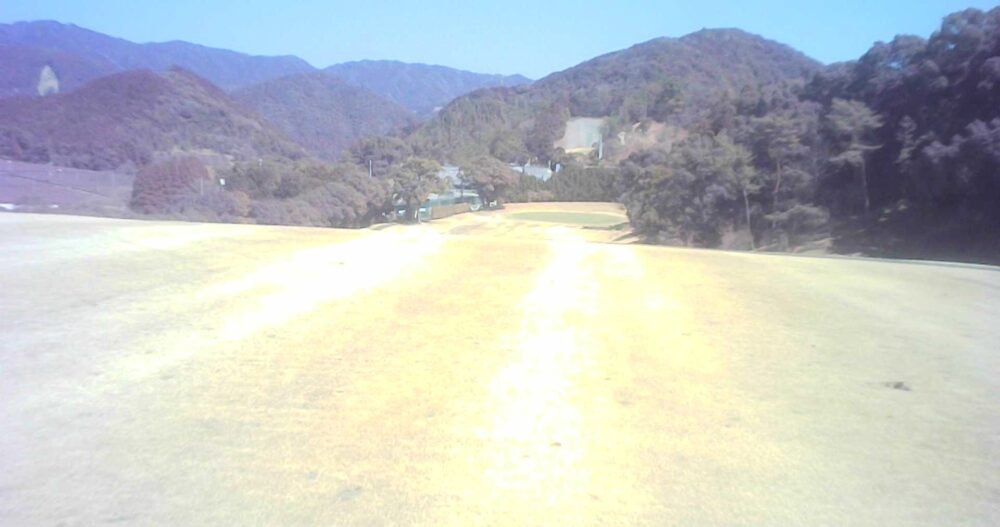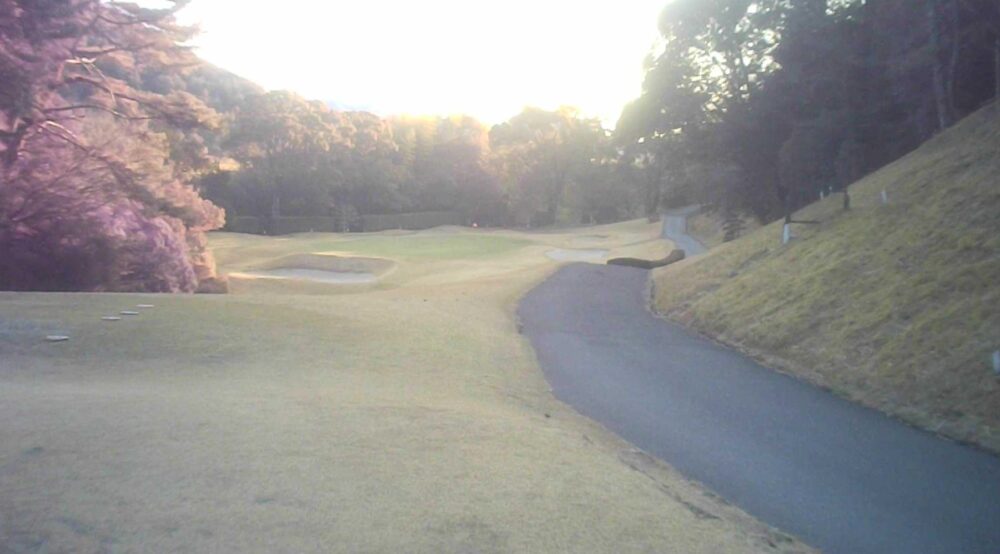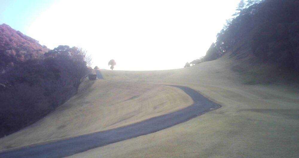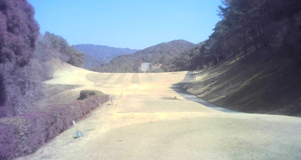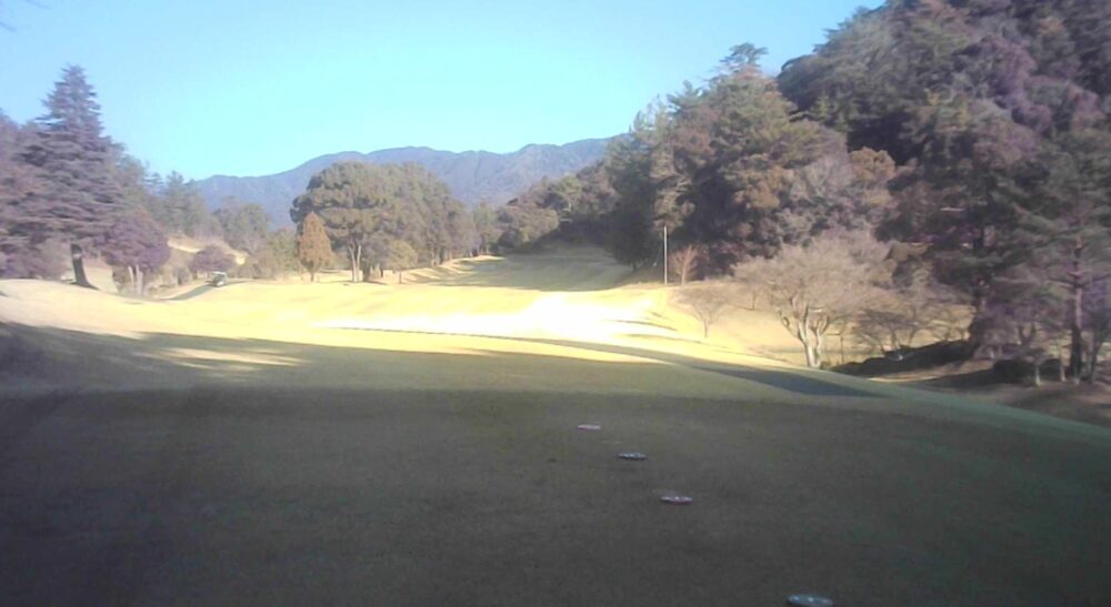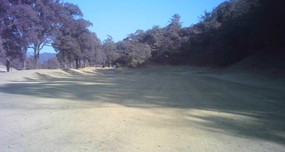 セカンドが打ち下ろしの真っ直ぐなホール。ティショットは斜面手前の平坦な場所へ。グリーンはアンジュレーションに富む。☆カート見えなくなってもティショット打ち込み注意。グリーンの奥に茶畑。