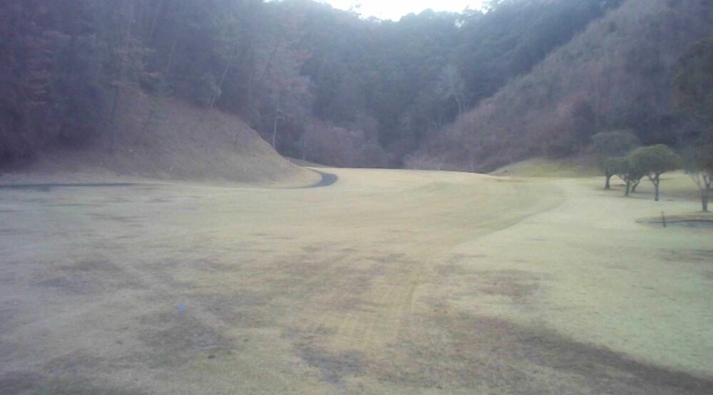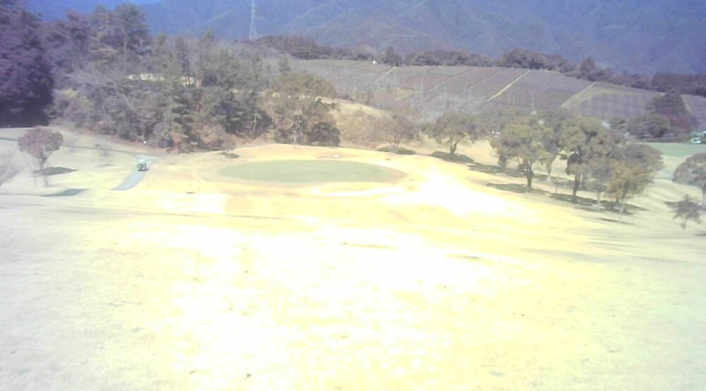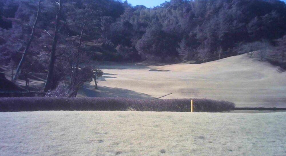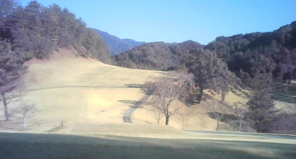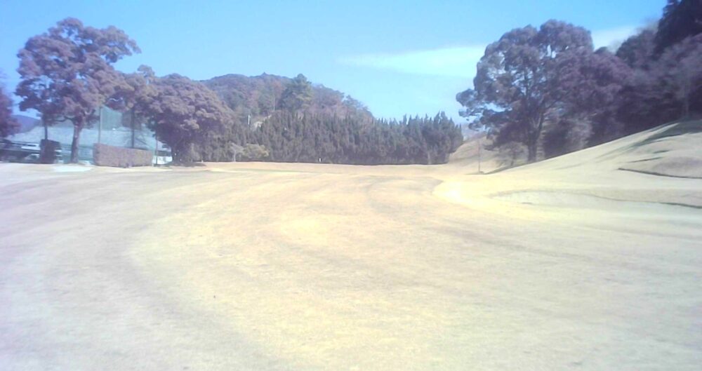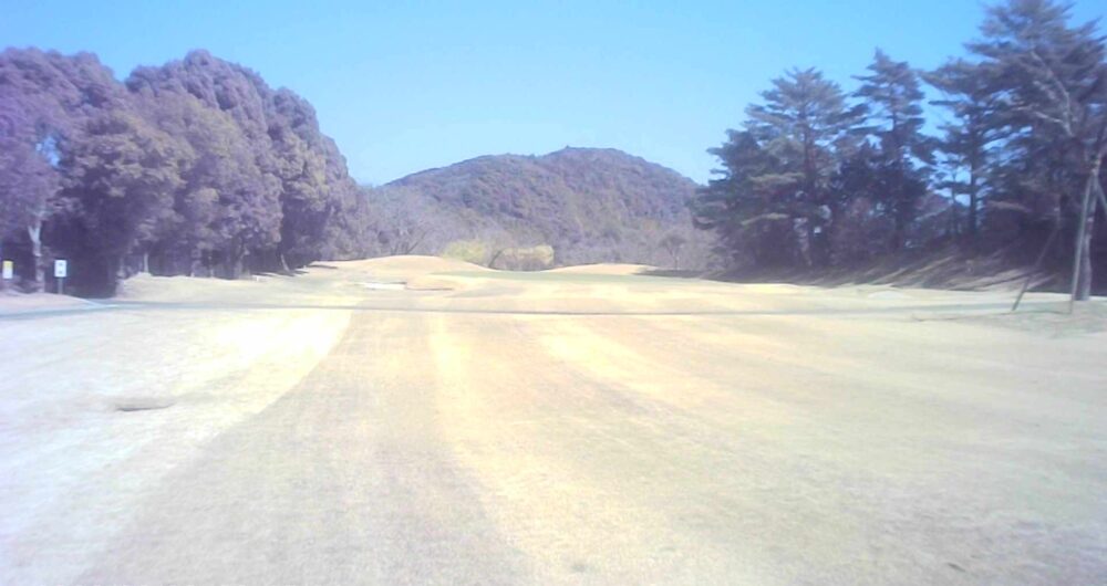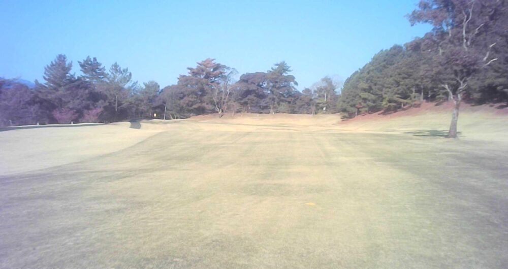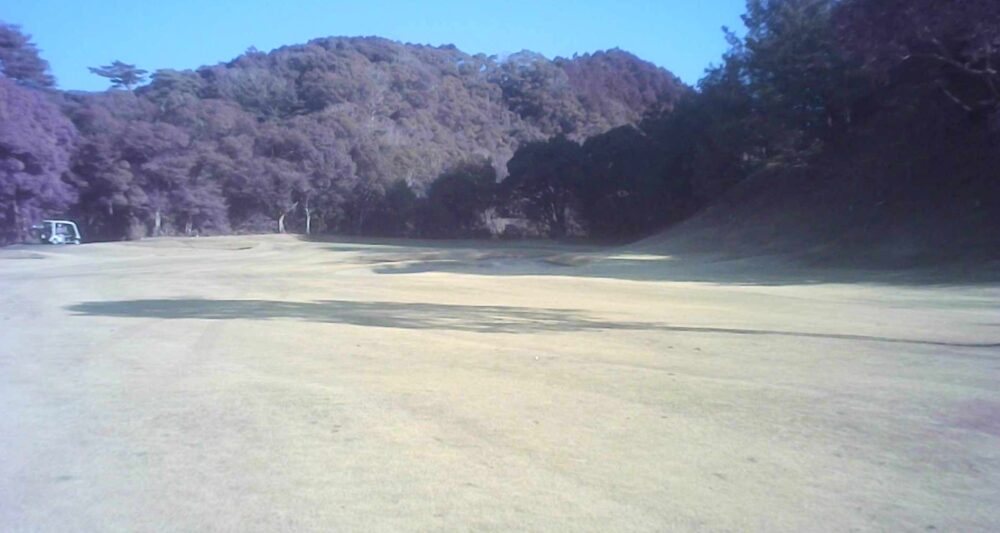 セカンドが打ち下ろしの真っ直ぐなホール。ティショットは斜面手前の平坦な場所へ。グリーンはアンジュレーションに富む。☆カート見えなくなってもティショット打ち込み注意。グリーンの奥に茶畑。